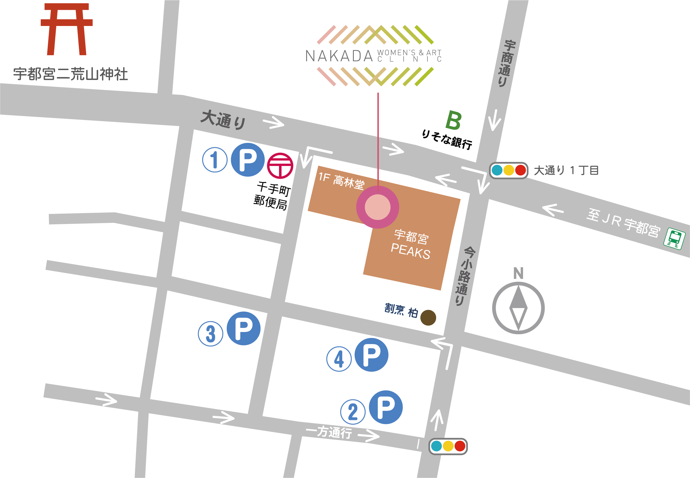 まずは当クリニックに最も近い、①「タイムパーク馬場通り第8パーキング(千手町郵便局となり)」をご利用ください。